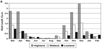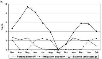 Figure 6. Average runoff potentials, irrigation volumes, and storage tank balances of RRWH systems with a roof size of 15 m2 during surveyed dry years, derived from samples collected across High, Middle, and Lowland regions (Pachpute et al, 2009).