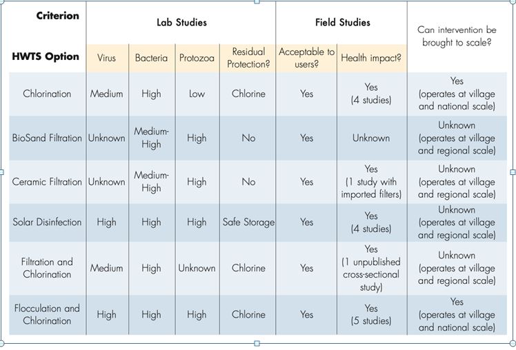 Figure 3: Summary of approved HWTS methods, note SODIS has “High” effectiveness across all “Lab Studies“ (Latagne et al, n.d.).